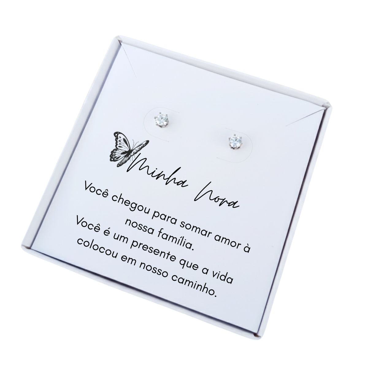 Brinco ponto de luz aço - Caixa presente com frase Nora