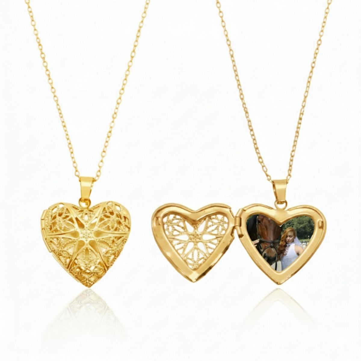 Colar relicário com foto de coração de aço com banho ouro